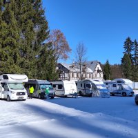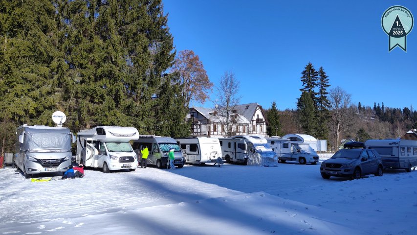 Pozemek je fajn v zimním období na pár noci hned pod sjezdovkou. Na více nocí chybí výlevka a možnost dočerpaní vody (samožřejmě možnost vyletí šedé vody)