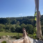 Prostorná sauna pro 4 osoby s výhledem do lesa, ochlazovací vana.