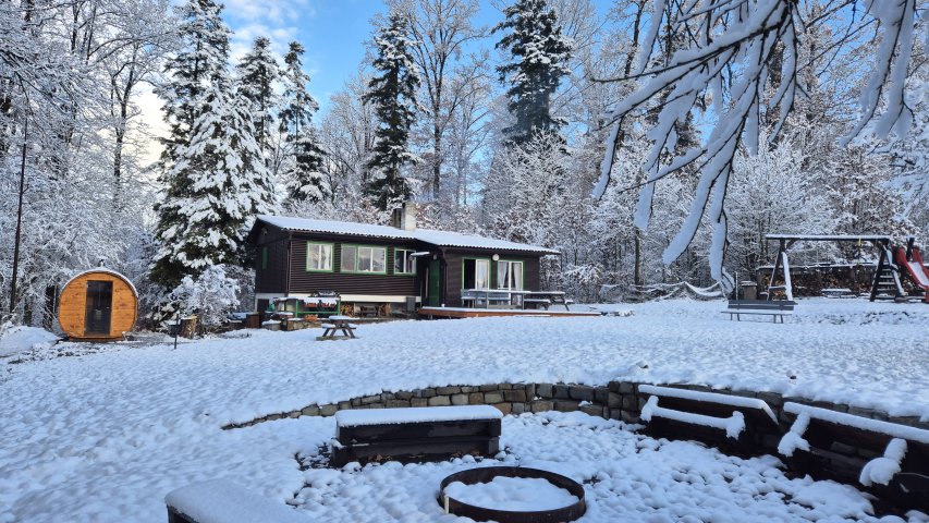 After leaving the main road No.438 follows: - 250m climb on a forest stone/gravel path; at the top after turning onto a forest contour (unpaved) - another 250m directly to the hut (the road leads nowhere else) - After rainfall it can be waterlogged in one place (so far it has been passable all year round even for low-riding cars) - Extra caution is advised with unusually low chassis - The last point of contact with the tarmac is 500 m from the cottage - (We are available to assist with our SUV) You will park right next to the lodge, 2-4 cars will fit.