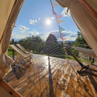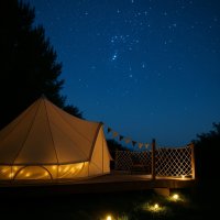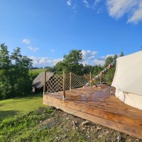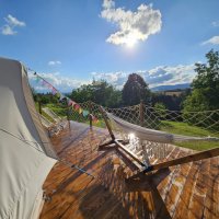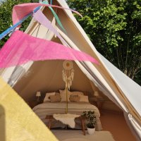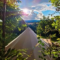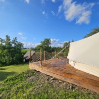 The accommodation is simple but cosy. Our tent is not in the middle of the wilderness, but in an environment where peace thrives despite the proximity of the world. You'll enjoy a comfortable bed, a warm open-air bath, a crackling fire and a view of the countryside.
