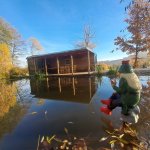 Parádní koupání.🤩Dřevo jsme si přivezli. Labutě chodí ráno sbírat popadané švestky. Celou noc pršelo-my odjezd z pozemku zvládli (4×4), ale některá auta bylo potřeba vytáhnout.